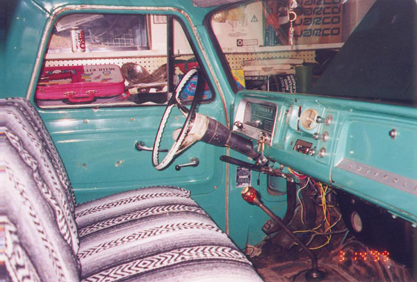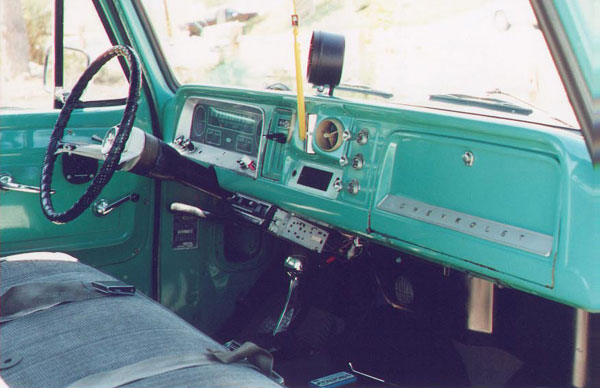 As it is now, its got a short fleet bed on it, one coil cut in front, 4 inch drop springs out back, a 1-1/8" front sway bar from a suburban, peep mirrors, solid rear glass, chrome bumpers, polished the rims... A TH-400 tranny with shift kit and B&M Quicksilver ratcheting shifter took the place of the old NP-420 four-on-the-floor, with 3.73:1 gears in the rear. Its nice for laying down some rubber when I'm back home. Still needs some legitimate body work and a paint job though.